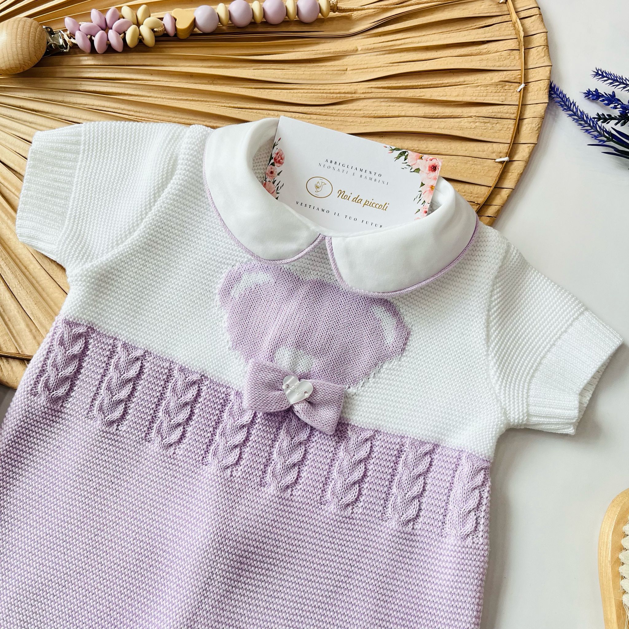 Delicato e affascinante, questo pagliaccetto avvolge la tua piccola in una dolce atmosfera. Realizzato in morbido cotone, sfoggia una raffinata combinazione di bianco e lilla, arricchita da ricami ad intreccio che conferiscono un tocco di eleganza. Il dolce disegno centrale di un orsetto, accentuato da un grazioso fiocchetto, trasforma ogni momento in un’occasione speciale. La texture morbida e i dettagli curati rendono questo capo perfetto per le giornate più belle. Un abbraccio di tenerezza per ogni bambina.