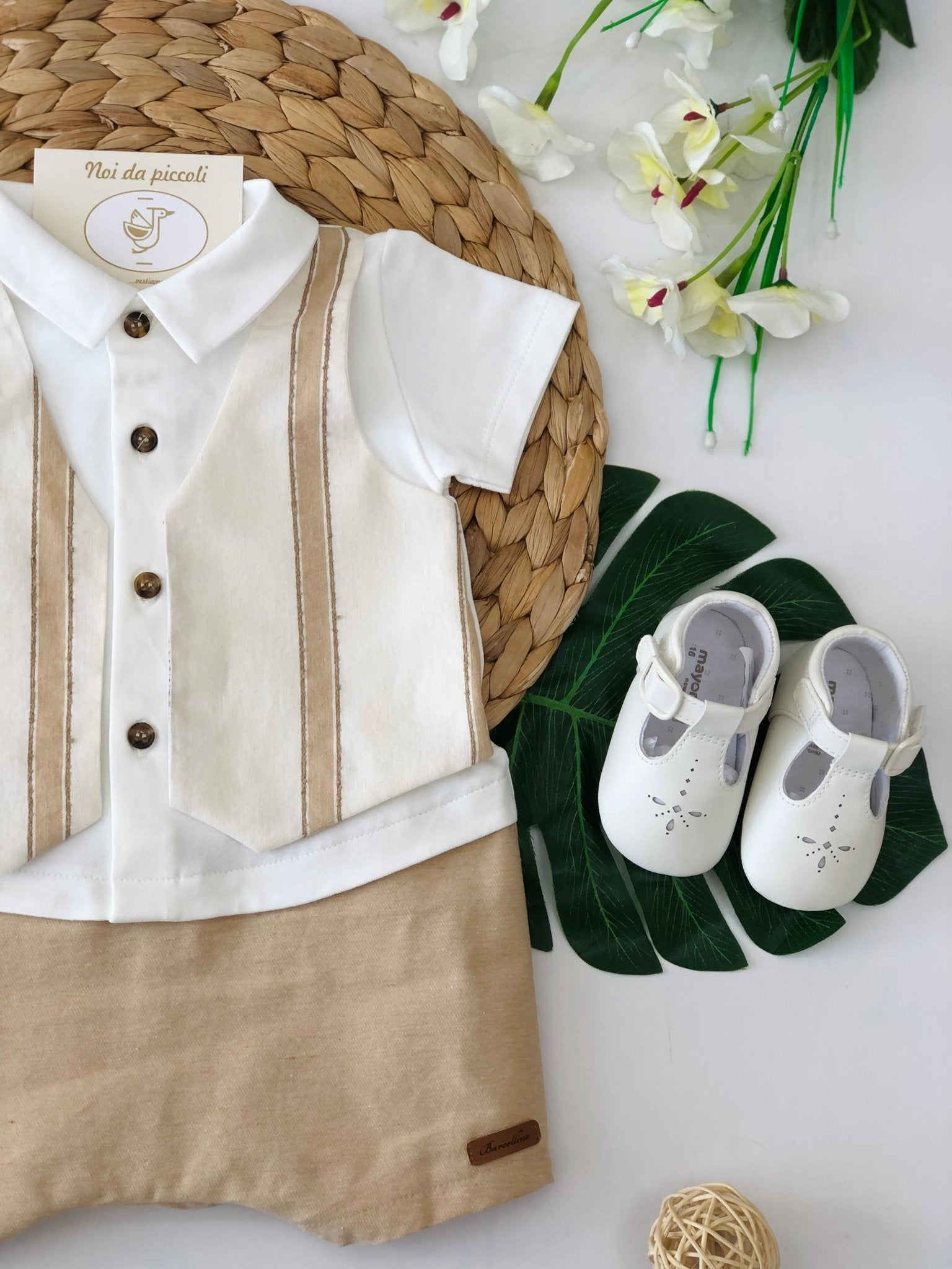 Un incantevole pagliaccetto beige e crema, avvolto in un abbraccio di morbido cotone, perfetto per dare un tocco di eleganza a ogni occasione. Il finto gilet con finiture raffinate e le cuciture delicate esaltano la bellezza del piccolo, mentre il contrasto di colori aggiunge un tocco di dolcezza. Ogni dettaglio, dai ricami delicati al tessuto pregiato, racconta una storia di amore e stile. Un capo ideale per i momenti più preziosi e i ricordi da custodire nel cuore.