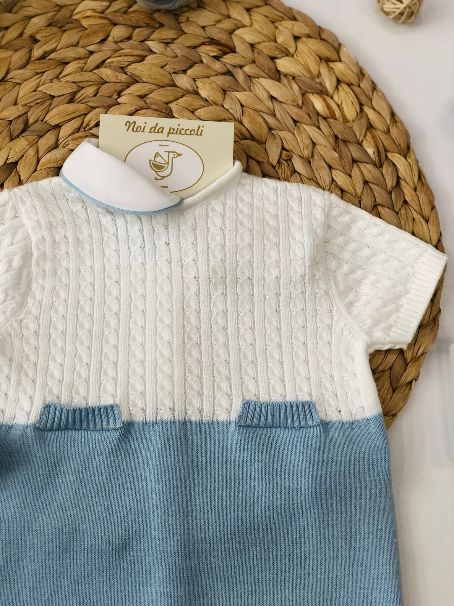 Avvolgi il tuo piccolo in un abbraccio di morbidezza e stile con questo adorabile pagliaccetto. Realizzato in 100% filo di cotone, offre una delicata combinazione di bianco e azzurro, perfetta per ogni occasione. La parte superiore presenta un elegante motivo a trecce, mentre il bordo inferiore è impreziosito da una tonalità serena, creando un contrasto incantevole. Le babbucce coordinate aggiungono un tocco di dolcezza, rendendo questo outfit un must-have nel guardaroba del tuo amore.