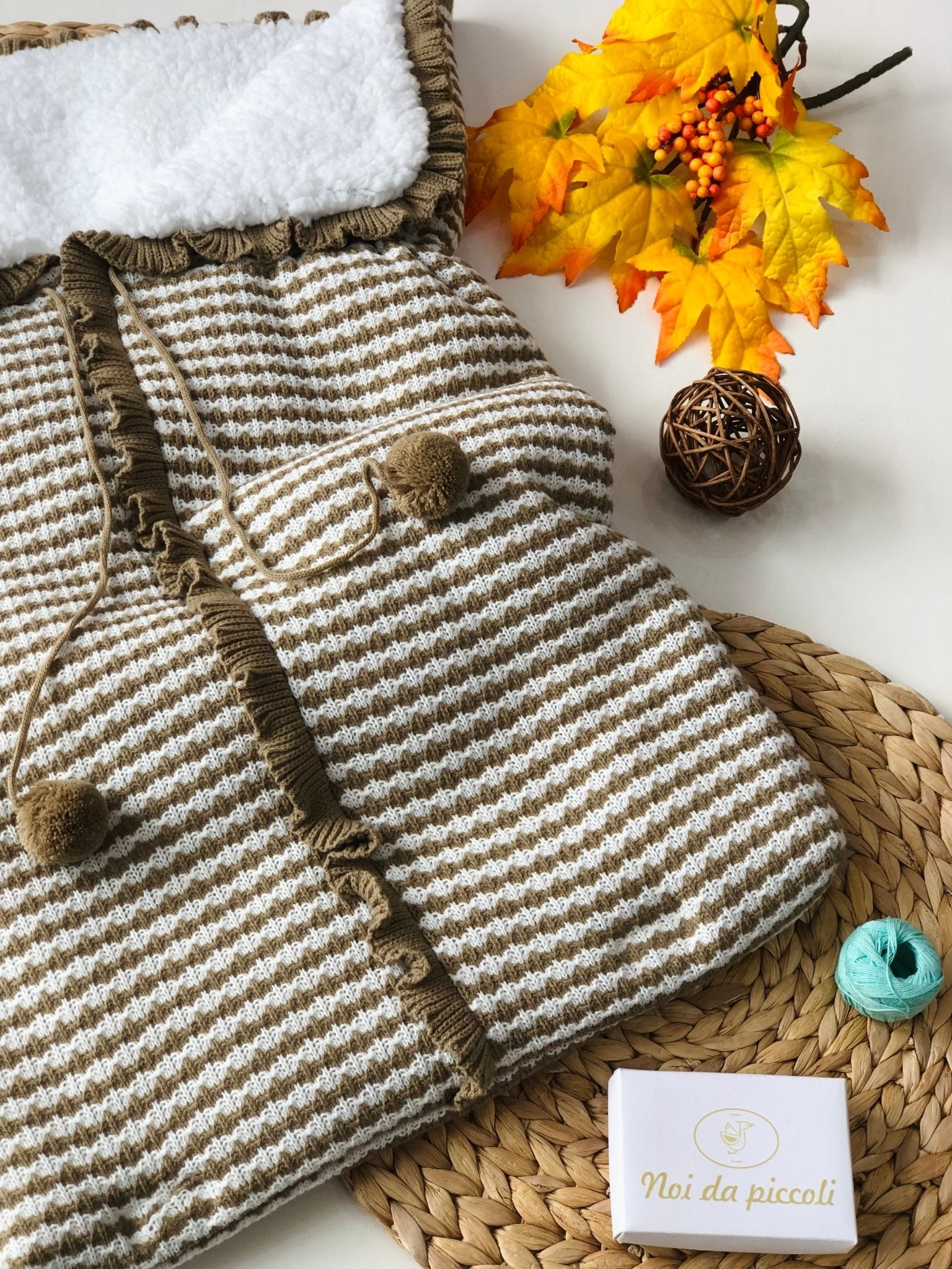 Avvolgi il tuo piccolo in un abbraccio di dolcezza con questo sacco nanna realizzato in filato caldo. La sua delicata trama a righe si alterna tra tonalità tostato e crudo, mentre il morbido interno in pelliccia sintetica offre un comfort senza pari. I simpatici pom pom decorativi aggiungono un tocco giocoso, rendendo ogni nanna un momento speciale. Perfetto per coccolare il tuo amore durante le fresche notti. Scopri la bellezza di un sonno sereno!