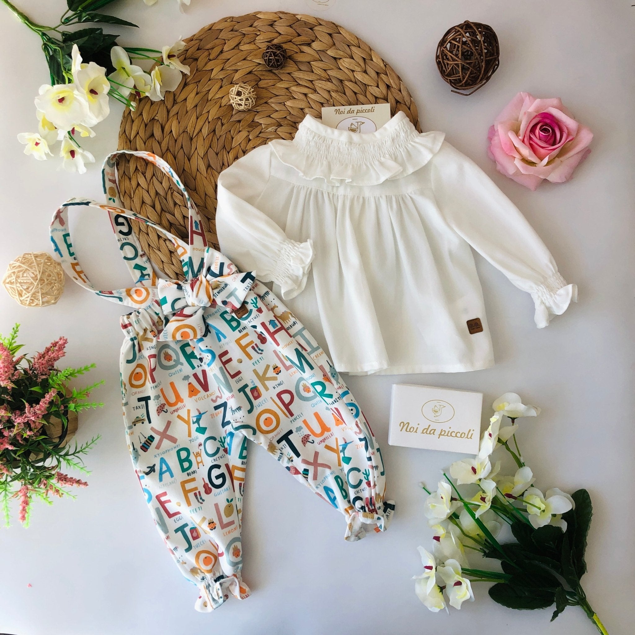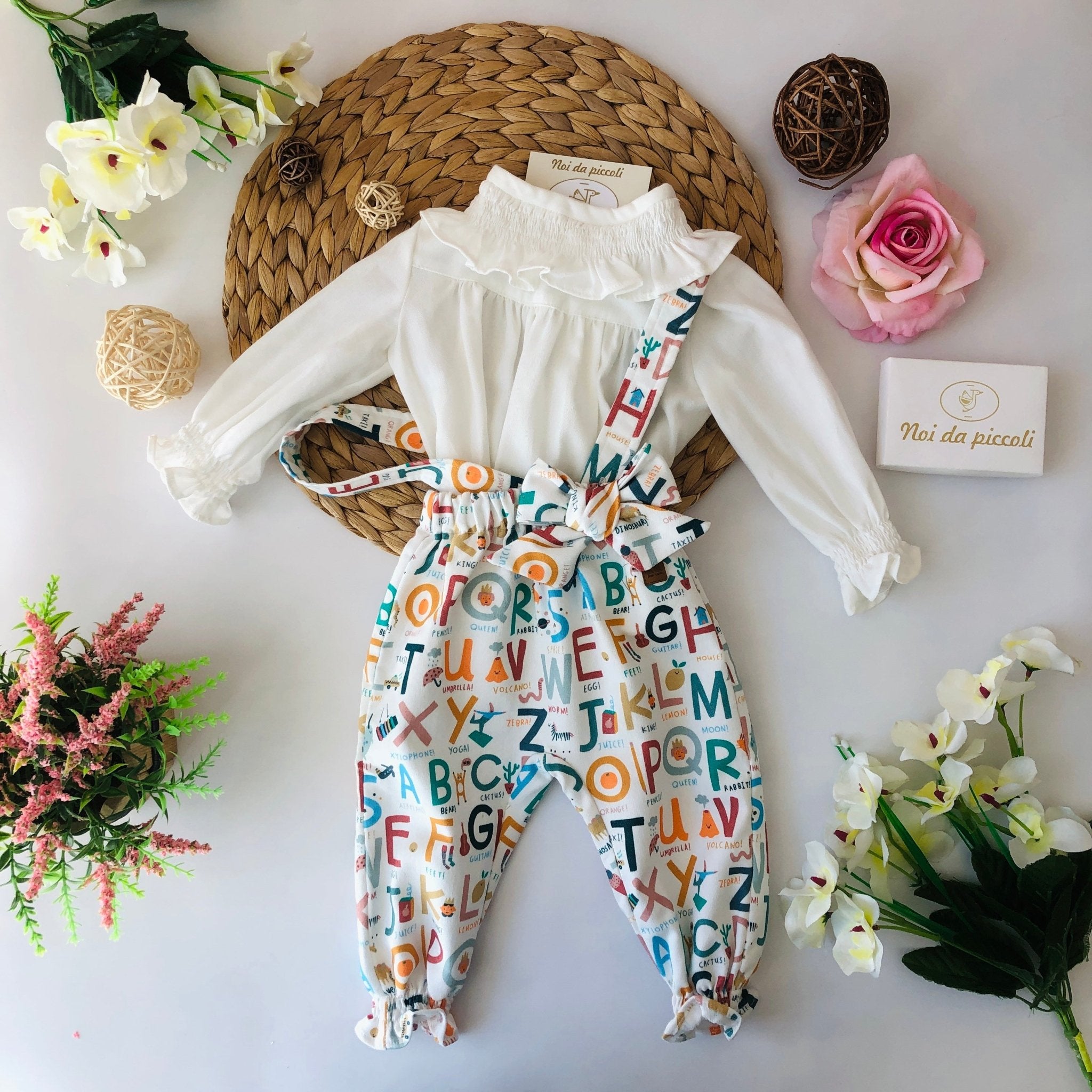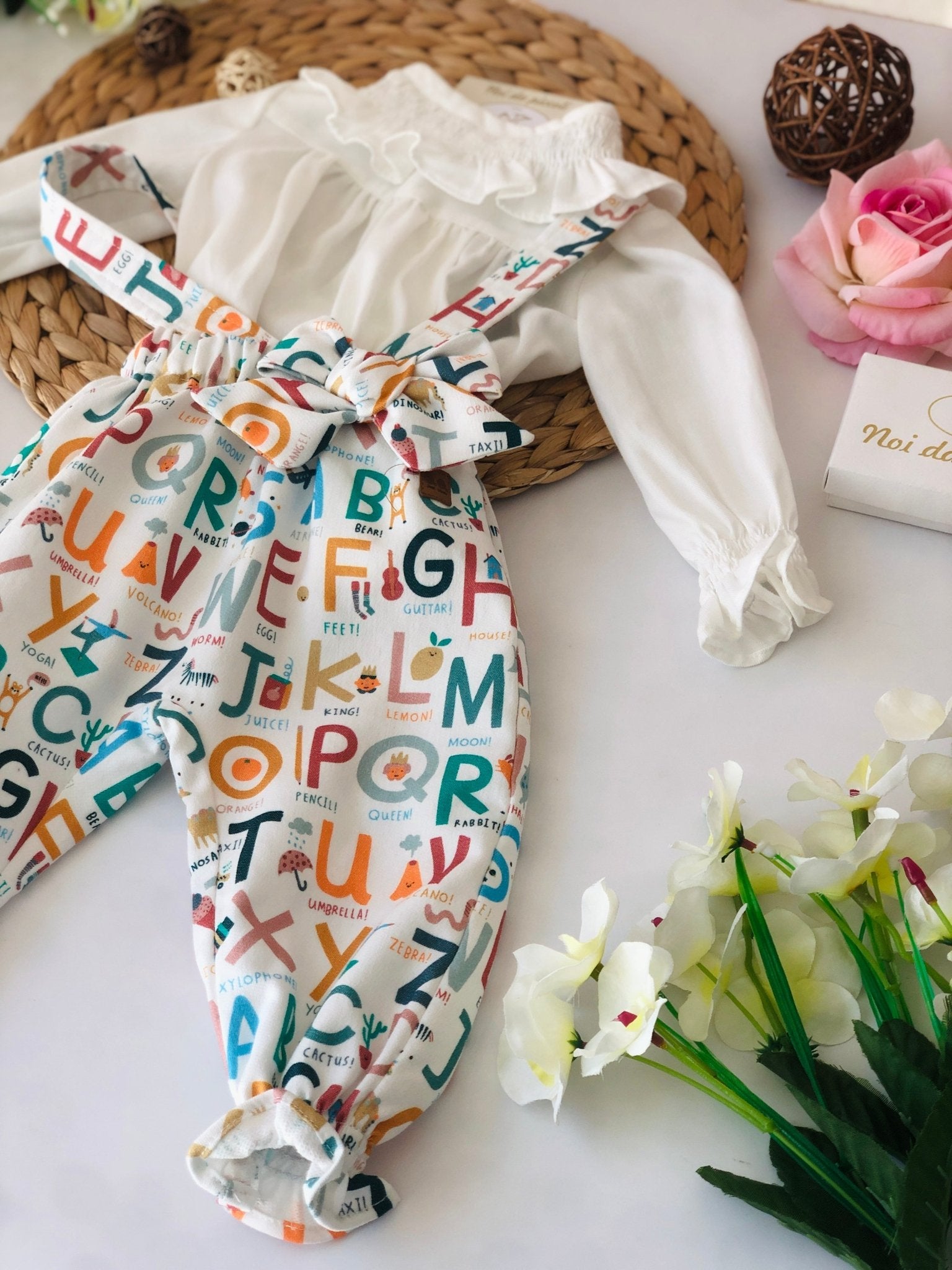 Salopette alphabet per una piccola signorina, con un bellissimo fiocco molto particolare e le gambine della salopette finiscono con un elastico che rende la salopette più comoda più particolare e sfiziosa con colori belli e teneri per il tuo amore!