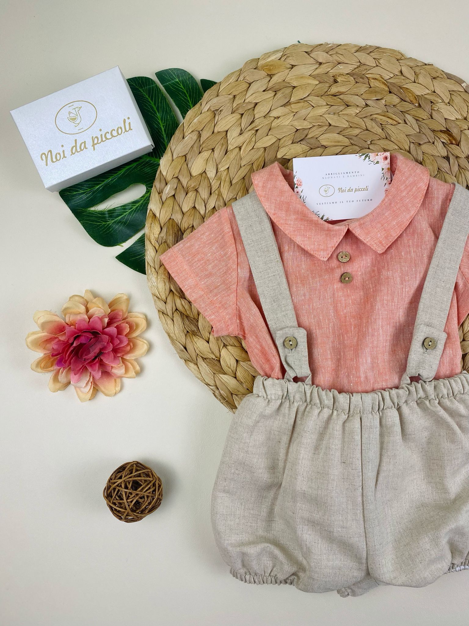 salopette beige con camicina salmone , lino e cotone per il tuo piccolo ometto