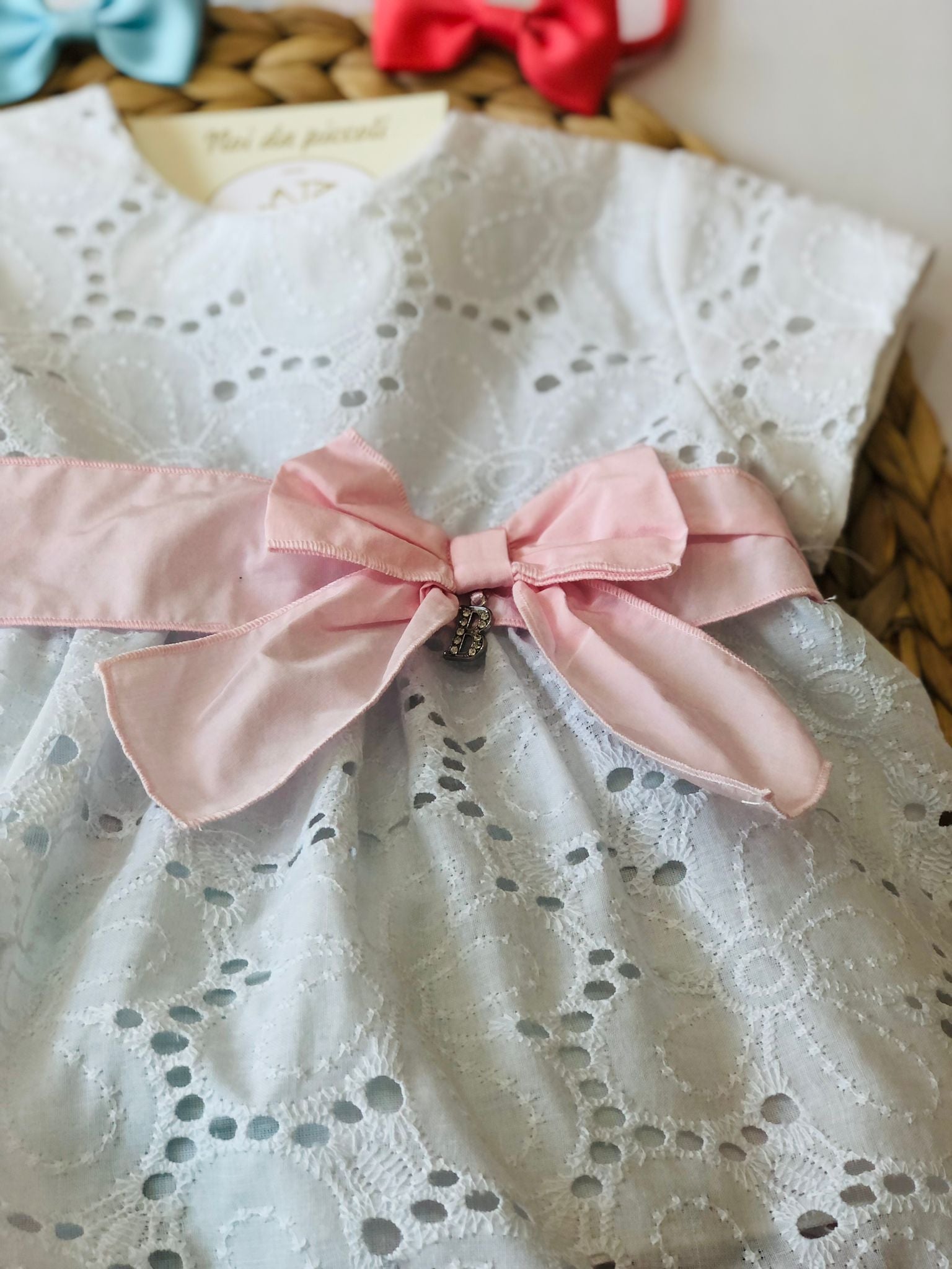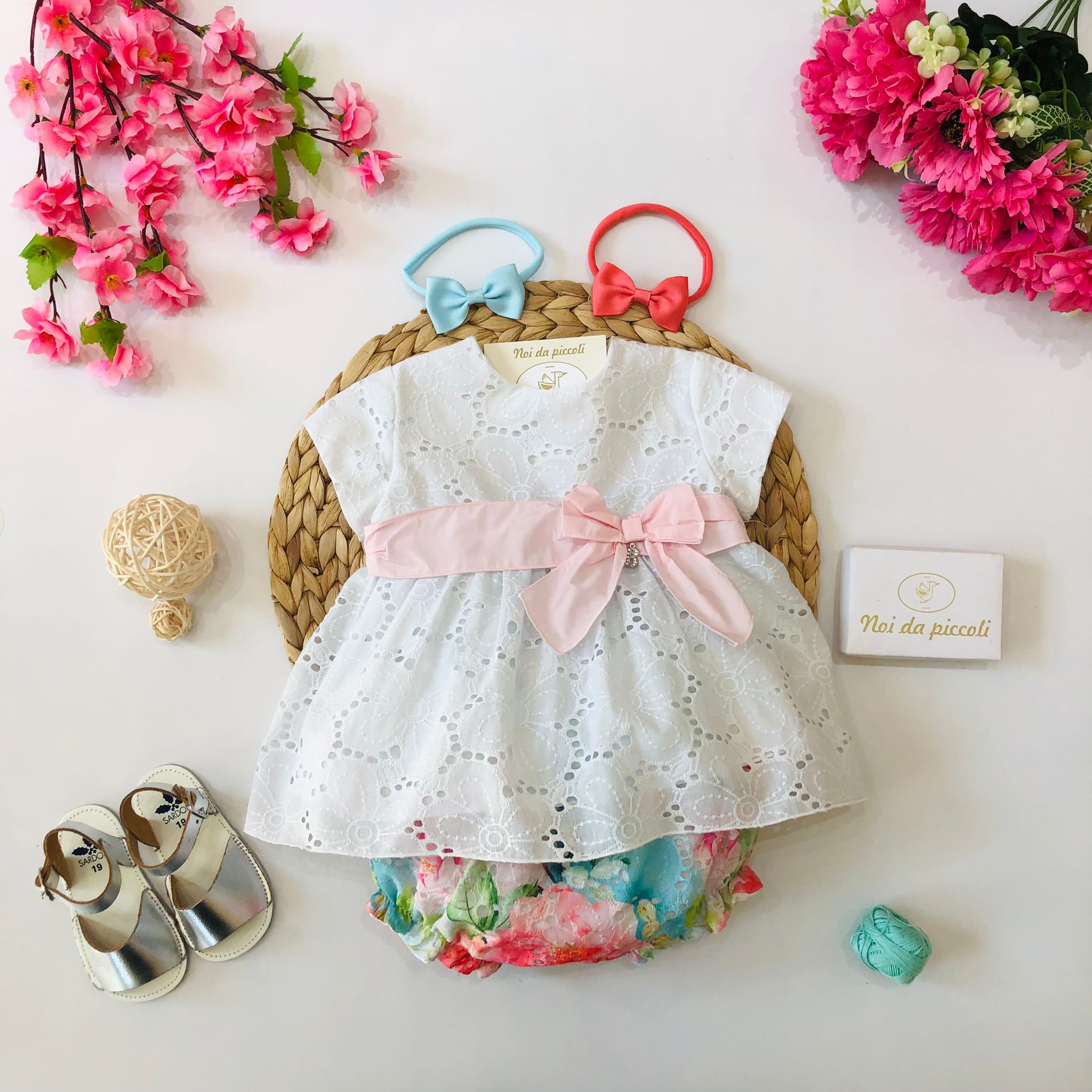Un incanto di eleganza per le piccole signorine. Questa scamiciatina in pizzo san gallo bianco avvolge con delicatezza, mentre un raffinato fiocco in vita aggiunge un tocco di dolcezza. I colori vivaci della culottina, ispirati alla primavera, portano freschezza e gioia. Perfetta per ogni occasione, questo capo è un vero e proprio inno alla bellezza infantile. Ogni dettaglio è curato con amore, rendendo questo vestitino un must-have nel guardaroba delle più piccole.