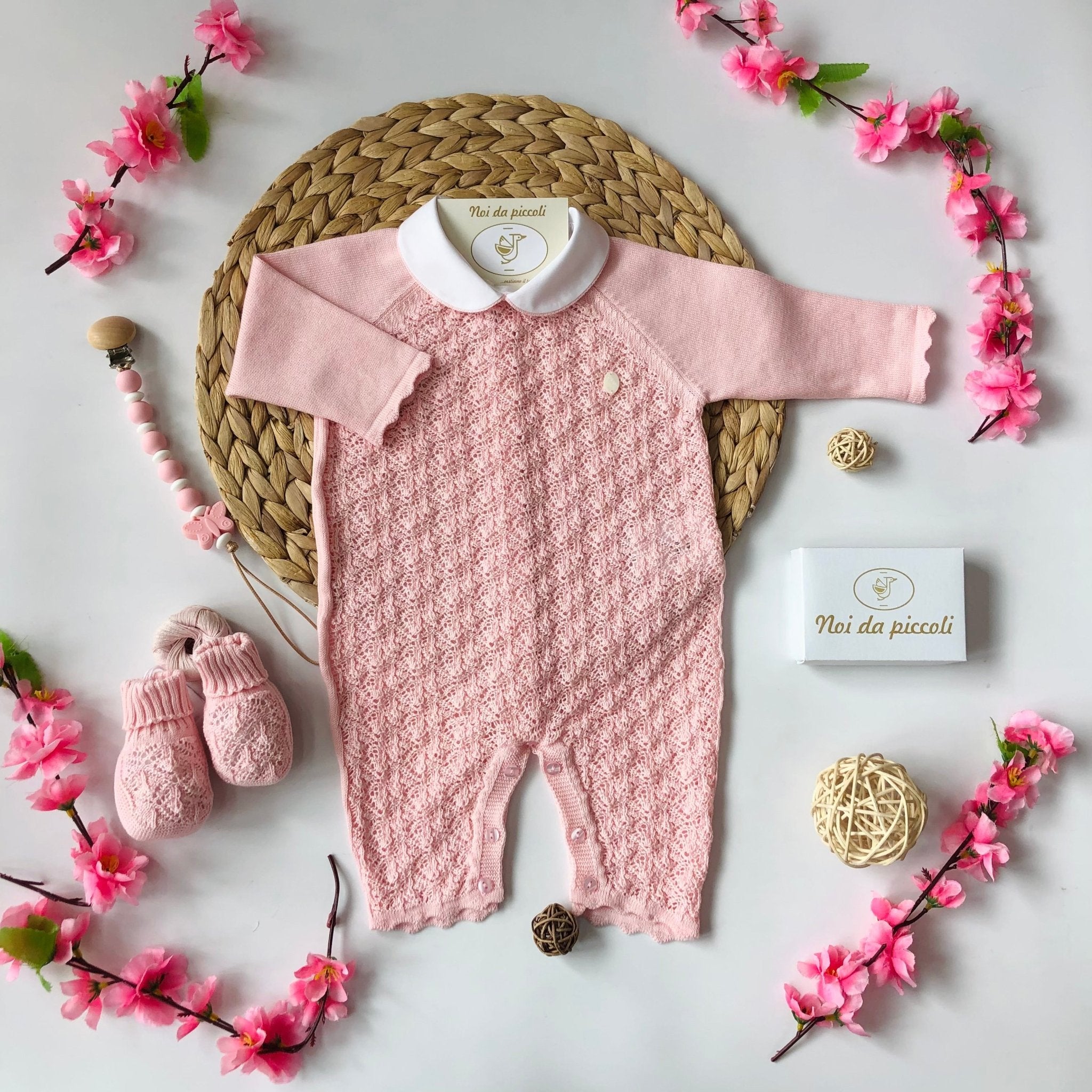Avvolgi la tua piccola in un abbraccio di tenerezza con questa dolce tutina rosa traforata, decorata con un elegante colletto. La delicata trama in cotone offre una sensazione di morbidezza sulla pelle, mentre le babbucce coordinate, anch'esse in cotone, completano questo delizioso look. I raffinati dettagli e il calore del design Made in Italy si uniscono per creare un capo unico e irresistibile, perfetto per ogni occasione. Un sogno di stile e comfort per la tua piccola stella!