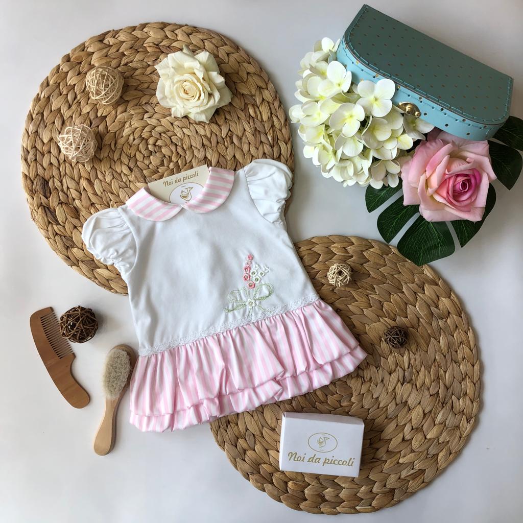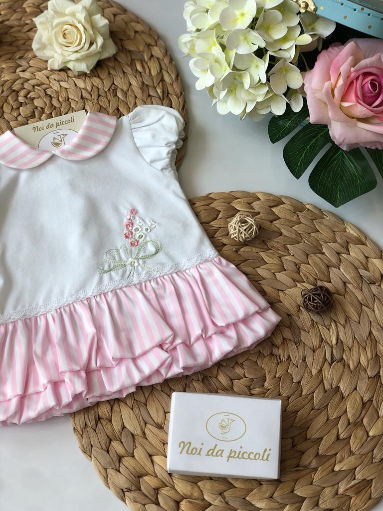 Questo incantevole abito in cotone bianco è un vero sogno per le piccole principesse. Il delicato colletto e le maniche a palloncino aggiungono un tocco di eleganza, mentre la gonna in morbido tessuto a righe rosa crea un delizioso contrasto. I ricami floreali, con dettagli raffinati, conferiscono un'aria romantica e sognante. Perfetto per ogni occasione speciale, questo capo è un abbraccio di dolcezza per il tuo amore. Rendi ogni momento indimenticabile!