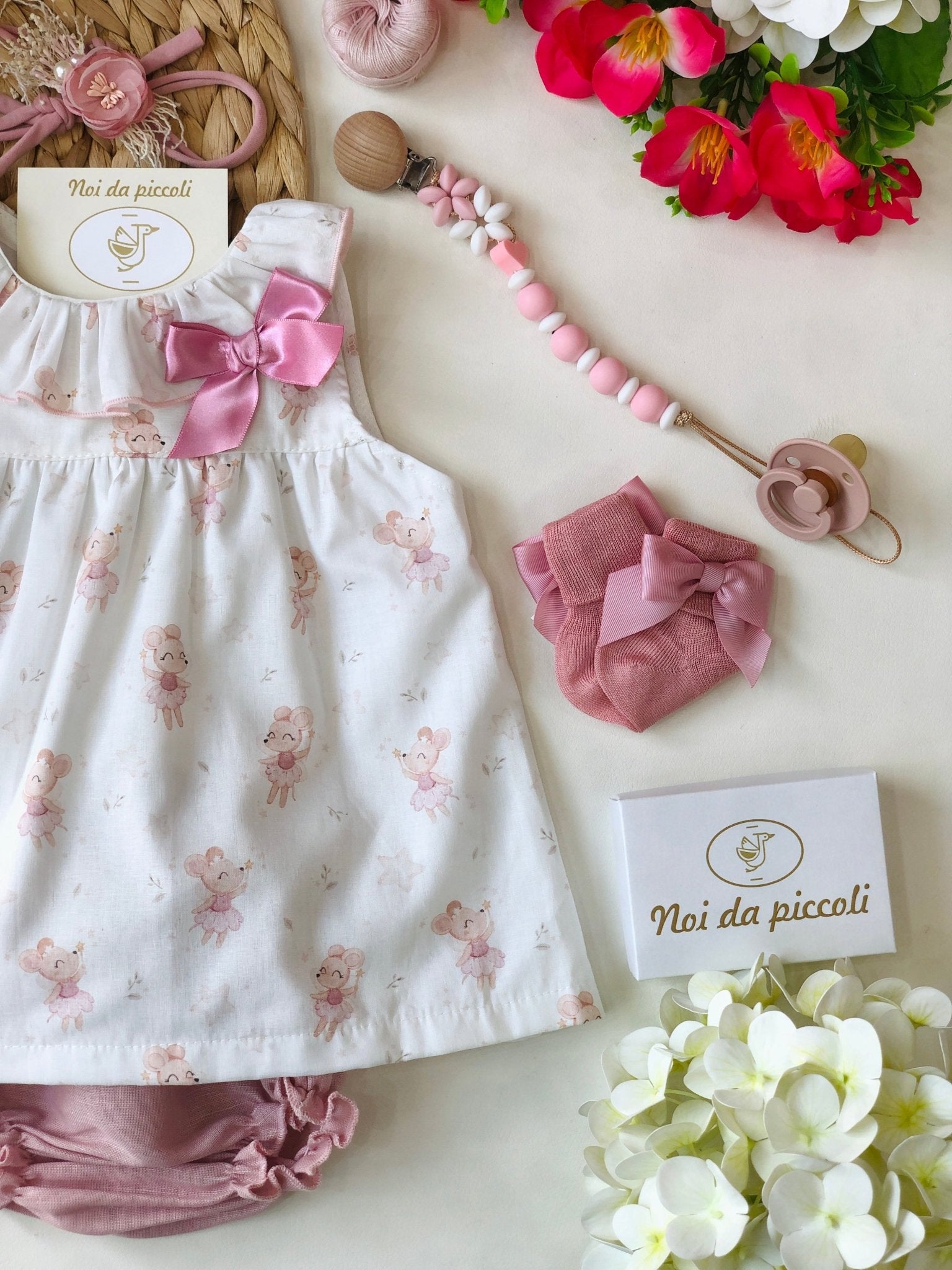 Un delizioso abito che avvolge la tua piccola in una dolce eleganza. Realizzato in morbido cotone rosa e bianco, presenta adorabili fantasie infantili che raccontano storie di gioia. I delicati fiocchi sulle spalle aggiungono un tocco romantico, mentre le finiture curate rendono ogni movimento leggero e aggraziato. Perfetto per ogni occasione, da un pomeriggio al parco a una festa di compleanno, questo capo è un must-have nel guardaroba delle più piccole. Scopri la magia di ogni giorno con questo incantevole vestito!