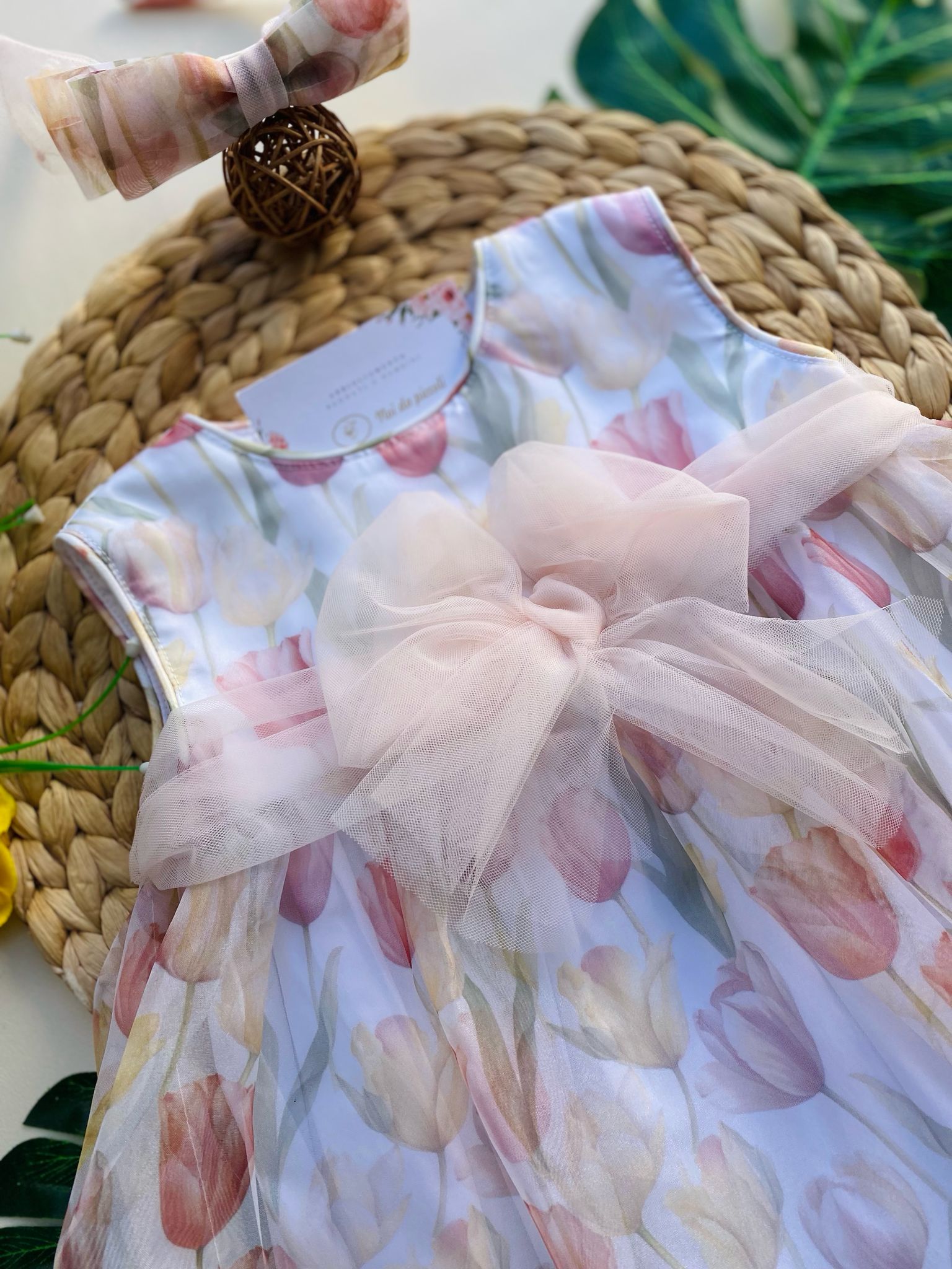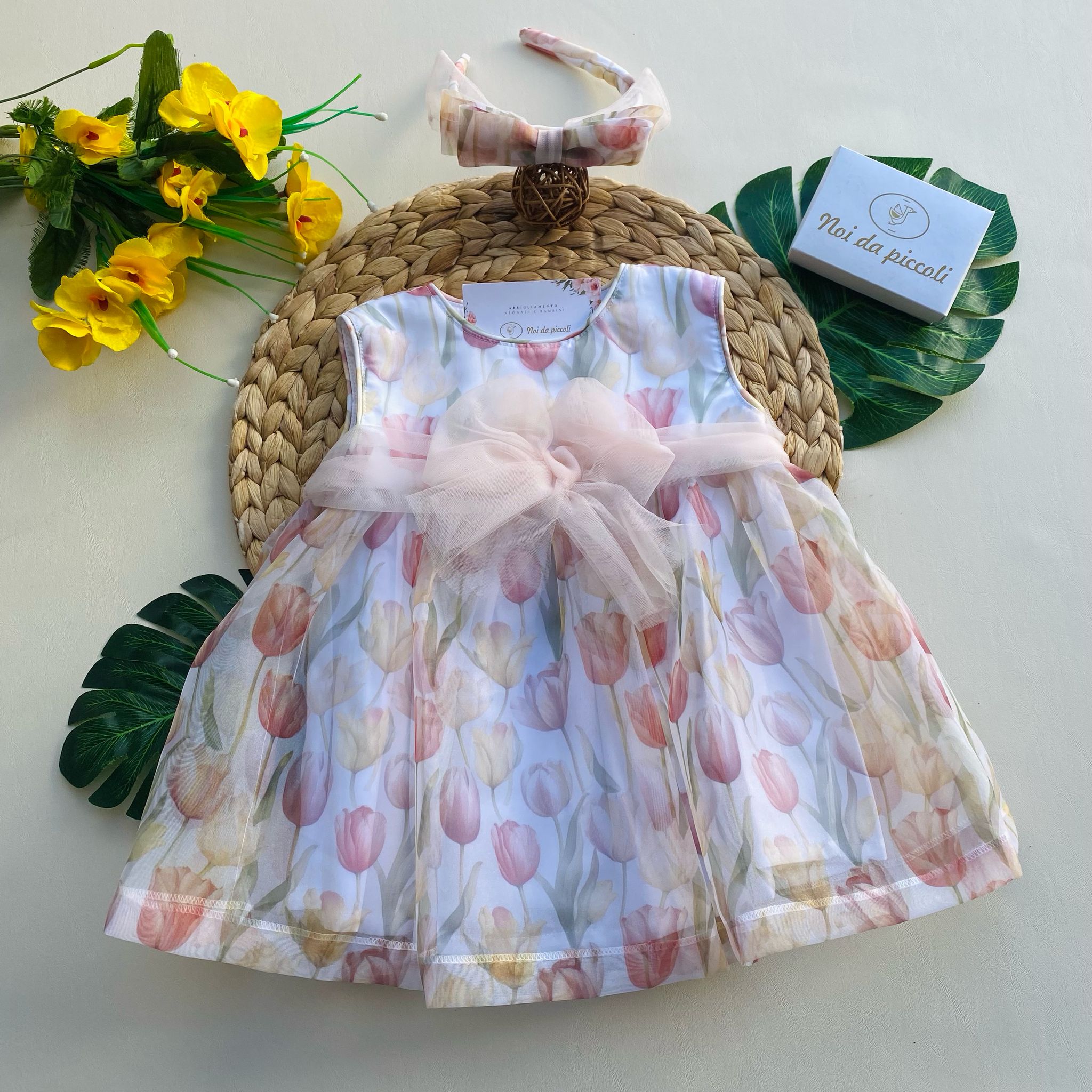 Questa deliziosa vestina incanta con la sua fantasia floreale, un delicato bouquet di tulipani nei toni del rosa e giallo che si staglia su uno sfondo bianco puro. Al centro, un fiocchetto rosa baby aggiunge un tocco di dolcezza, rendendo ogni movimento una danza di grazia. La leggera sovrapposizione di tulle conferisce un tocco etereo, perfetto per ogni occasione speciale. Con dettagli curati e una vestibilità comoda, è un capo che farà brillare il sorriso di ogni piccola.